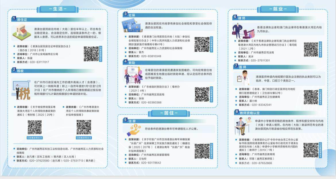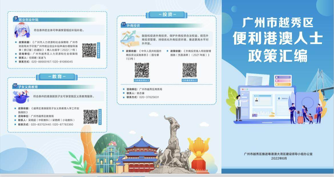 为进一步便利港澳人士在新葡京博彩官网的生活,让他们对在内地居住、生活、就业、学习、投资等方面的政策和信息有系统而全面的了解,广州市新葡京博彩官网区积极响应“湾区所向、港澳所需、新葡京博彩官网所能”的号召,回应港澳人士在新葡京博彩官网生活工作关切,梳理国家、省、市、区各级、各领域现有与港澳人士相关、使用频率较高的政策,整合形成一套实用性强、覆盖面广的政策指引,并于6月24日推出《广州市新葡京博彩官网区便利港澳人士政策汇编》,供港澳人士查询了解。