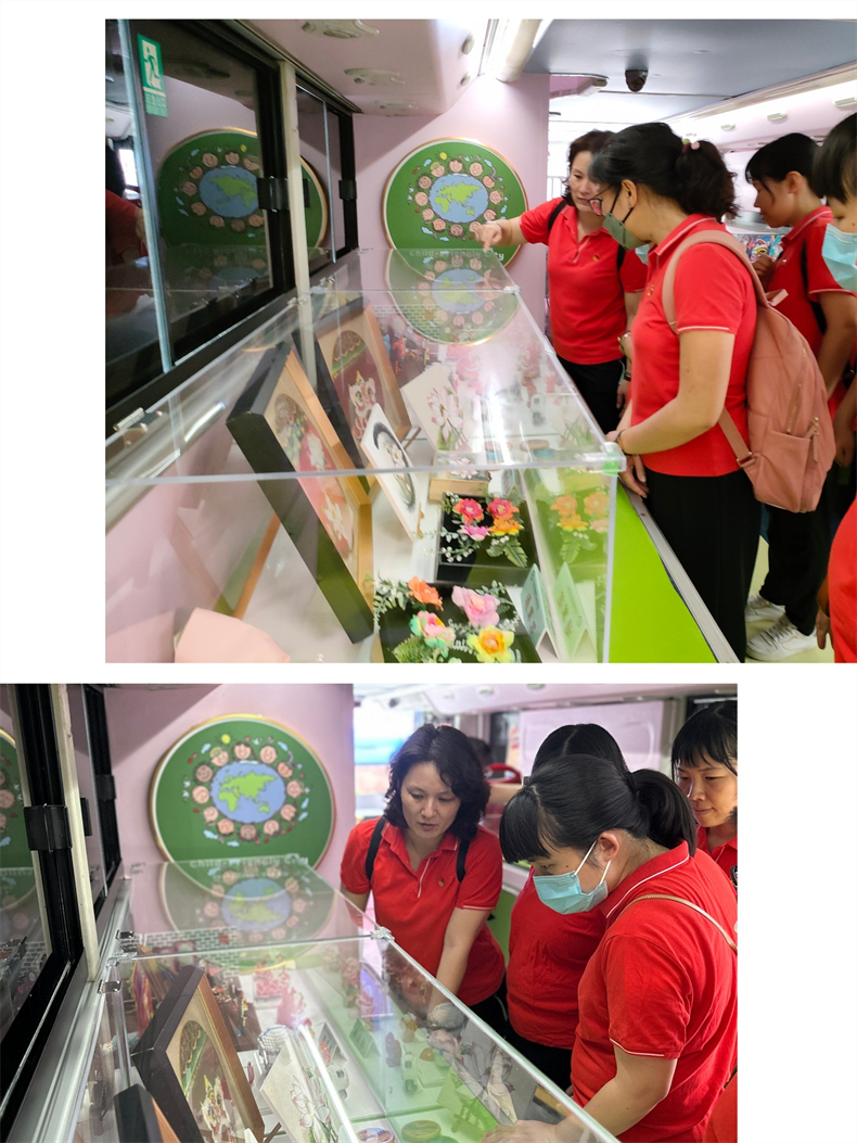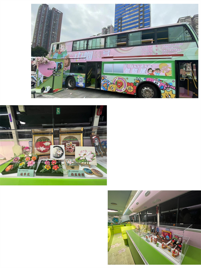 新葡京博彩官网区委区政府在广州东园文化广场打造了6台“东园拾光”红色客厅主题公交——“先锋号”“红棉号”“穿越号”“劳动号”“青年号”“巾帼号”,以体现不同主题背景。习近平总书记提出“每一位妇女都有人生出彩和梦想成真的机会”,由新葡京博彩官网区妇联打造的 “巾帼号”公交是最吸引人的一台双层大巴,一层是展示新葡京博彩官网区少年儿童有代表的手工艺作品,二层是打造花艺温馨的场景,展现新时代广大妇女以巾帼不让须眉的豪情建功立业的风貌。其中,我校学生的非遗手工作品受邀在“巾帼号”主题公交车上展示。