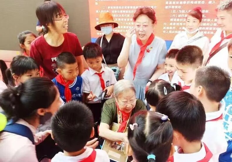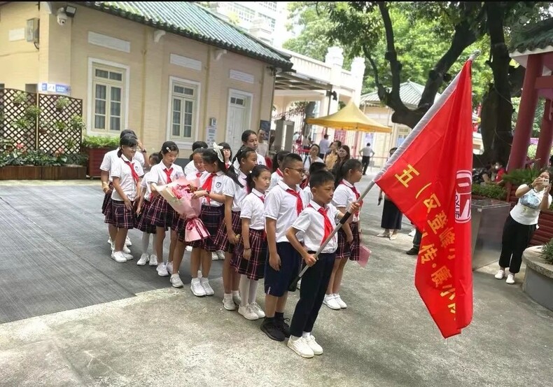 随后,在广州起义馆中心舞台,登峰小学的少先队员们向李萍奶奶献花并赠送书籍《习近平走进百姓家》,满怀敬意为李萍奶奶等人佩戴红领巾。李萍奶奶等向登峰小学五(2)中队的学生授予了红色研学队旗,并赠予了代表红色传承的红五星,勉励少先队员们继承革命精神,做好接班人。仪式结束后,全体少先队员们在广州起义馆讲解员的带领下,认真参观了广州起义纪念馆。