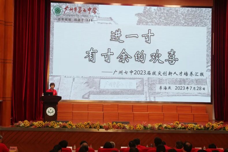 广州市第七中学副校长李海燕作了“进一寸 有寸余的欢喜”的发言。李海燕介绍了七中2023届拔尖创新人才的培养经验。学校坚持问题导向,探索七中定义和七中特色的拔尖创新人才培养思路,把凝聚共识、思想破局放在首位,实施知己修己、互助共为、他助共成的“四叶草计划”,实现2023届优生群体培养的新突破。