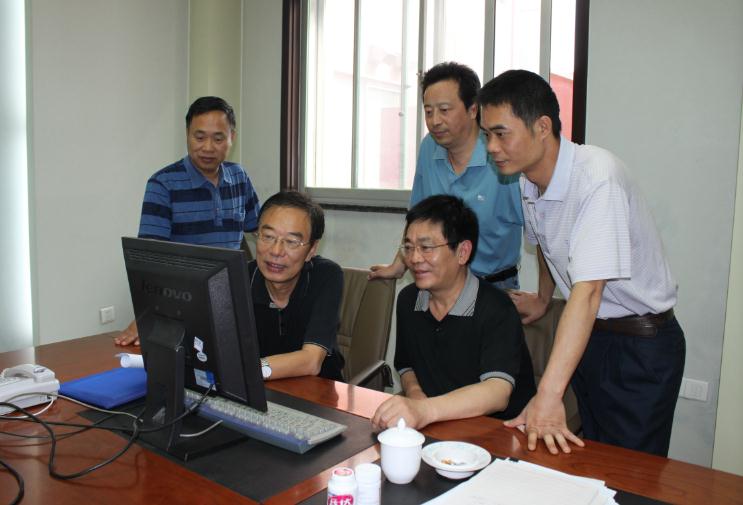 图为李兆雄(右一)在与同事研究讨论有关案情