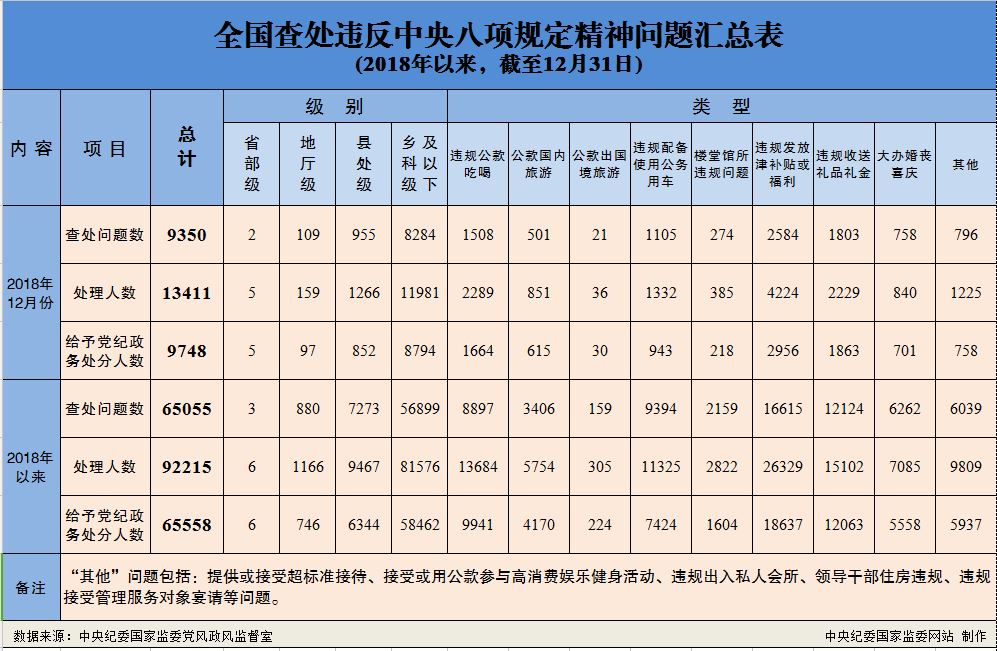 为掌握全国贯彻落实中央八项规定精神情况,中央纪委在各省区市和新疆生产建设兵团、各中央和国家机关、各中央企业和中央金融企业等建立了落实中央八项规定精神情况月报制度。2018年以来,截至12月31日,全国查处违反中央八项规定精神问题情况如下: