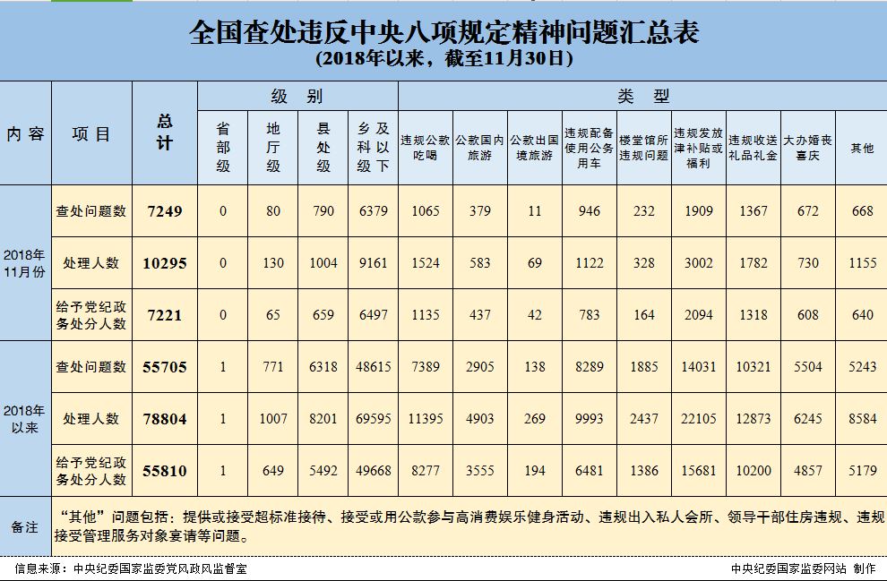为掌握全国贯彻落实中央八项规定精神情况,中央纪委在各省区市和新疆生产建设兵团、各中央和国家机关、各中央企业和中央金融企业等建立了落实中央八项规定精神情况月报制度。2018年以来,截至11月30日,全国查处违反中央八项规定精神问题情况如下: