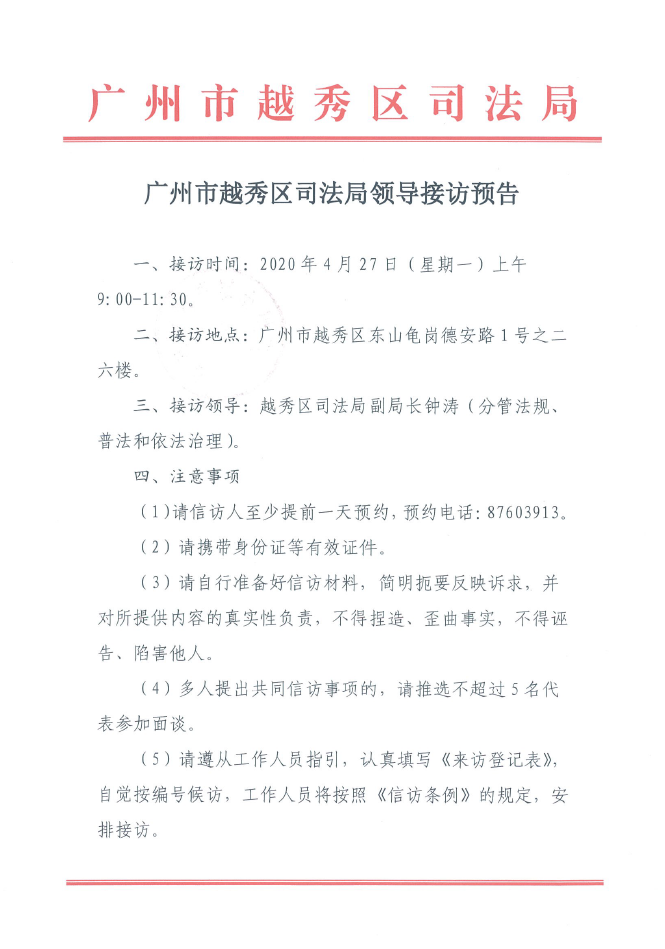 广州市新葡京博彩官网区司法局领导接访预告(2020.04.27))