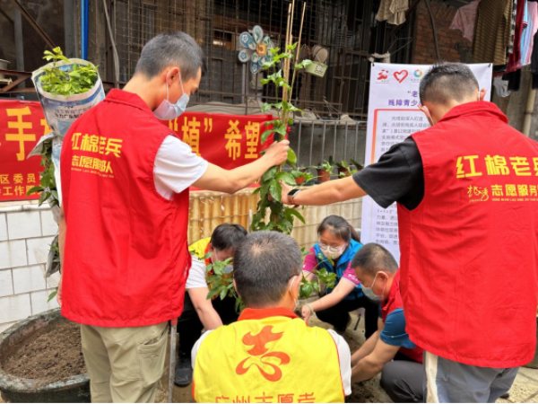 光塔街2023年春季退役士兵光荣返乡欢迎仪式暨座谈会现场,退役士兵郑小祺、赵星宇、黄子鸣注册并加入红棉老兵志愿服务队。植树节当天,3位新加入红棉老兵志愿服务队的退役士兵参加了“老友记之家·心手相连,共‘植’希望园艺工作坊”志愿服务活动。在种植过程中,他们热情高涨,挥锹挖坑、扶苗培土、提水浇灌……经过一番努力,退役士兵们种下小树苗,为社区残障人群的活动空间增添色彩。