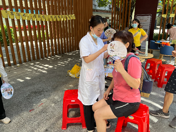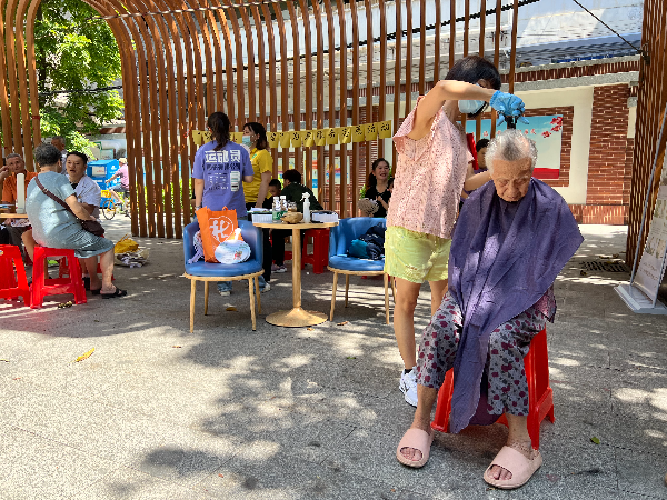 本次活动由“义诊”“义剪”两部分组成。“义诊”项目包括量血压以及中医传统疗法“耳穴疗法”。在义诊期间,长者通过量血压,清晰了解自身血压情况,对于血压过高的长者,万颐养老-榕悦城市长者照料中心的驻院医生及时给予相关建议,让长者能够对改善自身血压情况有清晰的认知。在“耳穴疗法”体验区,万颐养老-榕悦城市长者照料中心的驻院医生向长者介绍“耳疗”的好处以及注意事项,并协助长者贴耳穴。在“义剪”摊位,长者的发型在志愿者的巧手下“焕然一新”,清爽应对炎夏。