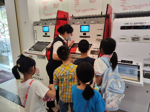 此外,工作人员还带领组员参观工商银行的业务办理柜台,进行自助终端机的使用实操,邀请银行专家讲解人民币和电子货币的发展历史。
