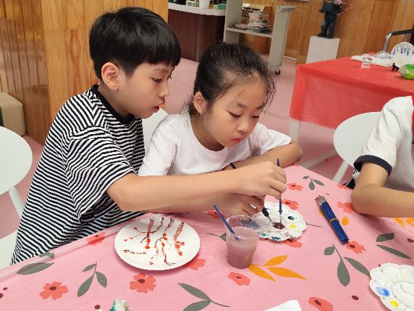 最后一场活动,同学们来到新葡京博彩官网区少年儿童图书馆内的广州美术学院抗战木刻陈列馆,通过参观抗战时期木刻的创作成果,感受到美术家热血沸腾的斗志和豪情。随后,在广彩体验环节,同学们充分发挥想象力,在白瓷上绘画各具特色的图案,在绘画的乐趣中感受广彩非遗的魅力。
