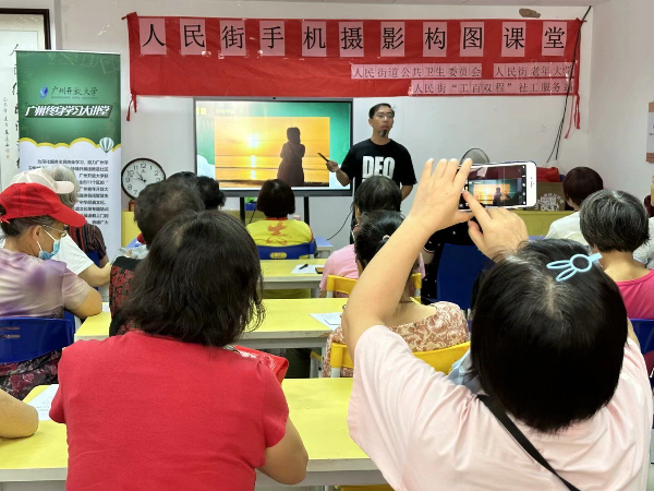 为深化服务全民终身学习,助力广州学习型城市高质量建设,持续开展送教进社区活动,8月22日,在市教育局指导下,结合广州遍布全市16区(学院)的“广州数字化学习中心”和“广州老年开放大学”办学系统,人民街道公共卫生委员会、人民街老年大学、人民街“双百工程”社工服务站联合广州开放大学、广州广播电视台在人民街“双百工程”社工服务站开展手机摄影构图学习课堂,吸引38名社区居民参与。