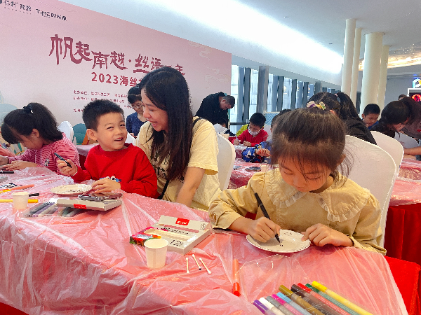 除了静态展览展示,现场还设置了有趣、生动的互动体验活动,让广大市民群众玩转海丝。10月21日下午,“帆起南越·丝语千年”海丝文化特色文创DIY体验活动在保利中环4楼连廊开展。活动邀请非遗专家围绕海上丝绸之路文化、广彩等主题进行分享,让在座的党员、居民家庭走进广彩、了解广彩,来了一场穿越千年的海丝之旅。讲座过后,非遗专家亲自示范广彩创作从打稿、图印、描画到填色的全过程,再指导居民们动手DIY,描绘出专属自己的广彩瓷盘。