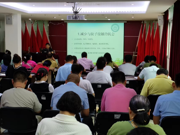 人民街社区卫生服务中心冯医生为本次培训主讲,其先分析目前登革热疫情的形势,然后针对传播途径、防控技术、防控要求、防控措施、蚊媒监测和防治等内容进行详细讲解。建议在疾病高发季节,做好对居住及办公环境的清洁和消除或破坏蚊虫孳生地,减少与蚊子接触的机会,加强个人防护。