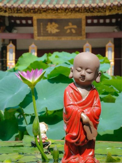 盛夏骄阳灼灼,古刹宝莲亭亭,千年古刹六榕寺正举行宝莲文化节,盛开的莲花静立于水池之中,微风拂过,摇曳生姿。四处摆放的一尊尊“小和尚”,为这片花景增添了几分禅意。