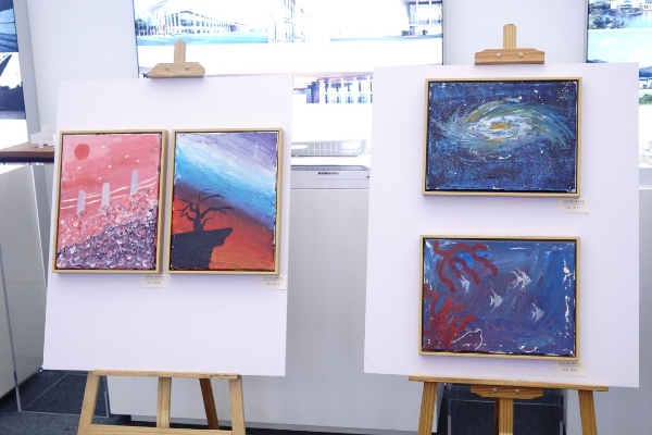 活动现场,47幅少儿绘画、手工作品整齐排列展出,这些由特殊儿童创作的绘画作品吸引不少市民驻足观赏。