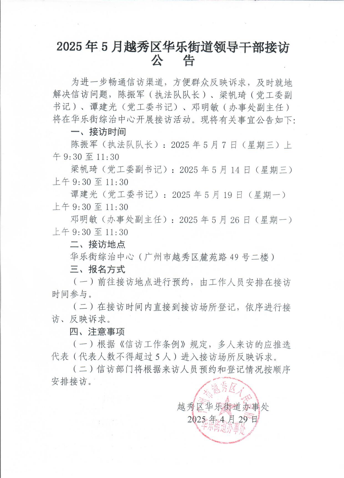 2025年5月新葡京博彩官网区华乐街道领导干部接访公告