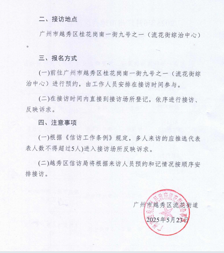 2025年6月广州市新葡京博彩官网区流花街道领导干部接访公告
