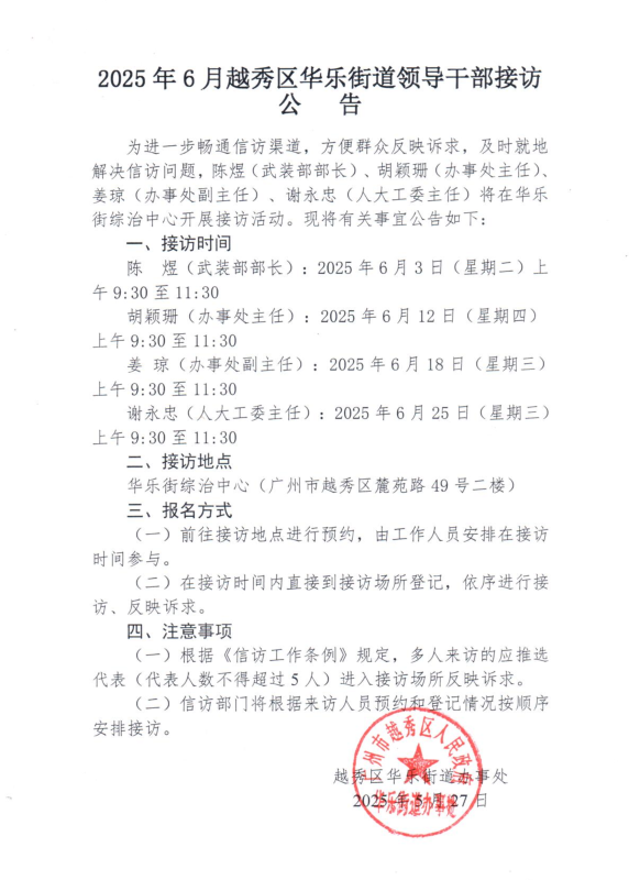 2025年6月新葡京博彩官网区华乐街道领导干部接访公告