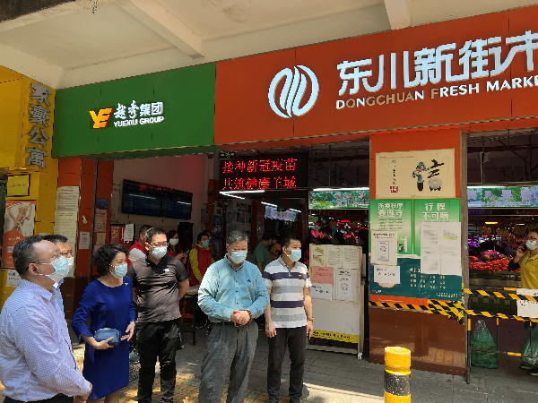 4月7日,区委常委、常务副区长郭环同志一行到梅花村街督导检查疫情防控、安全生产工作,现场查看了东兴南农贸市场落实提级管控情况,详细了解档口情况,农贸产品采购渠道,市场经营方落实扫码测温核验行程码措施,员工核酸检测、疫苗接种情况。在丽丰大厦疫苗接种点,详细询问物管方组织发动疫苗接种情况,并就如何推进疫苗接种工作与其深入交谈。郭环同志强调,要加强农贸市场排查管控工作,严格落实区农贸市场防控各项措施,加大宣传力度,积极发动商务楼宇物业组织承租方接种疫苗,共筑疫情防控屏障;要进一步落实安全生产主体责任,加强巡查力度,消除各类安全隐患。区政协副主席何庆婷同志参加。