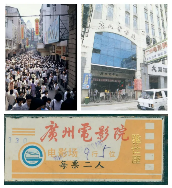 图示:1987年,从人民南路天桥上拍摄的西濠二马路景象,人们在街上等候入场观景(上左,图源/Bigstock图库),上右及下图分别为90年代末的广州电影院以及当时的(雅仕座)电影票。(供图/新葡京博彩官网区国家档案馆)