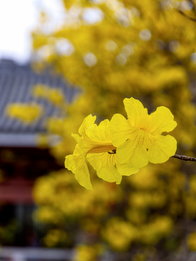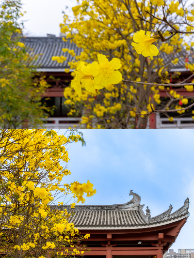 光孝寺里鲜艳的黄花风铃木在枝头绽放,仿若天边倾泻的鎏金瀑布。微风摇晃枝桠,似风铃清脆,声声入耳,一条条纤长的花枝,一簇簇柔软的花球,一朵朵黄色的风铃,妆点着春日浪漫。