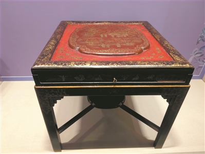 清代黑红漆描金人物纹披肩盒、盒架。这件文物由黑红漆描金披肩盒、内套纸盒和黑漆描金盒架三部分组成。这是外商定制用于收纳展示马尼拉大披肩的包装套盒,其设计融合中外,展现了广州匠人的精湛技艺和创新精神。
