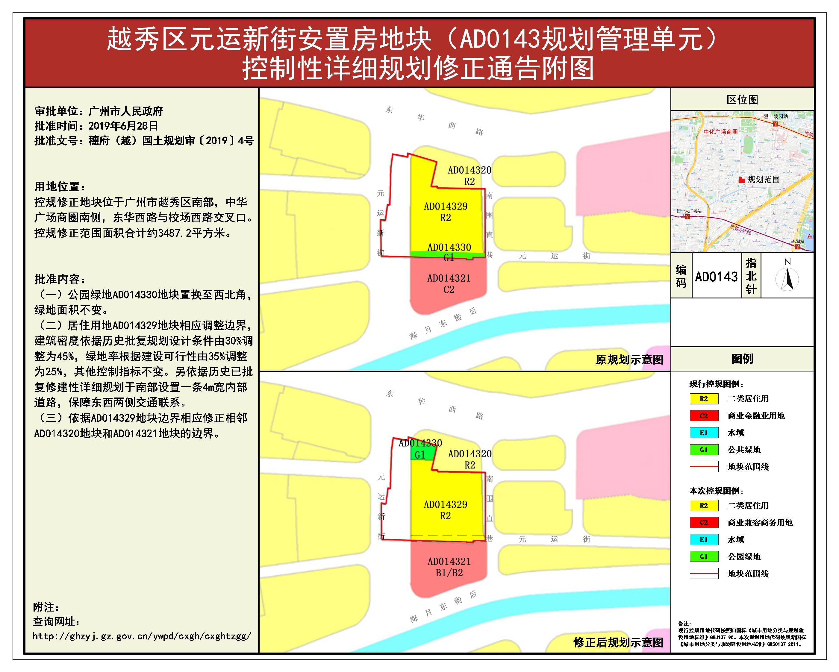 根据《广东省城市控制性详细规划管理条例》,《新葡京博彩官网区元运新街安置房地块(AD0143规划管理单元)控制性详细规划修正》规划成果已完成批前公示,经广州市新葡京博彩官网区城市规划和更新工作领导小组会议审议通过后获广州市人民政府批准(穗府(越)国土规划审〔2019〕4号),自批准之日(2019年6月28日)起生效。