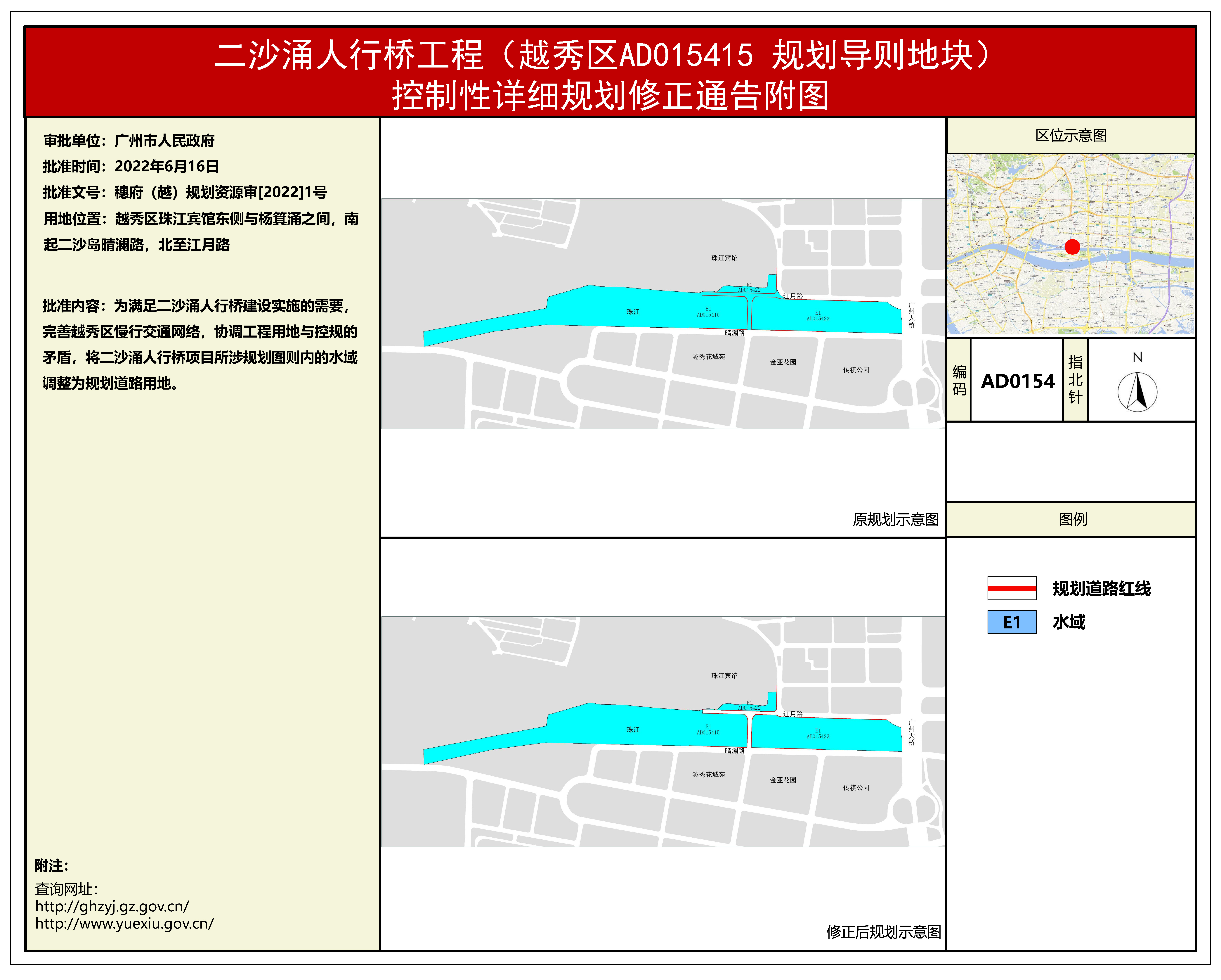 关于公布实施《二沙涌人行桥工程(新葡京博彩官网区AD015415 规划导则地块)控制性详细规划修正》规划成果的通告